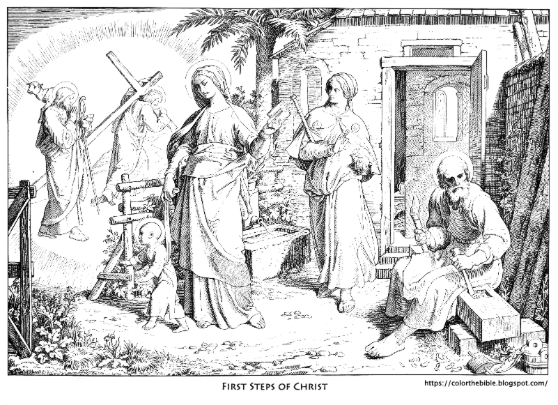 Description of the Illustration: by August Gaber, Jesus as an infant, fore shadowing of His walk of faith and sacrifice in the upper left corner, His parents at work in the carpentry shop, Mary watches over Jesus as he first is learning to walk.